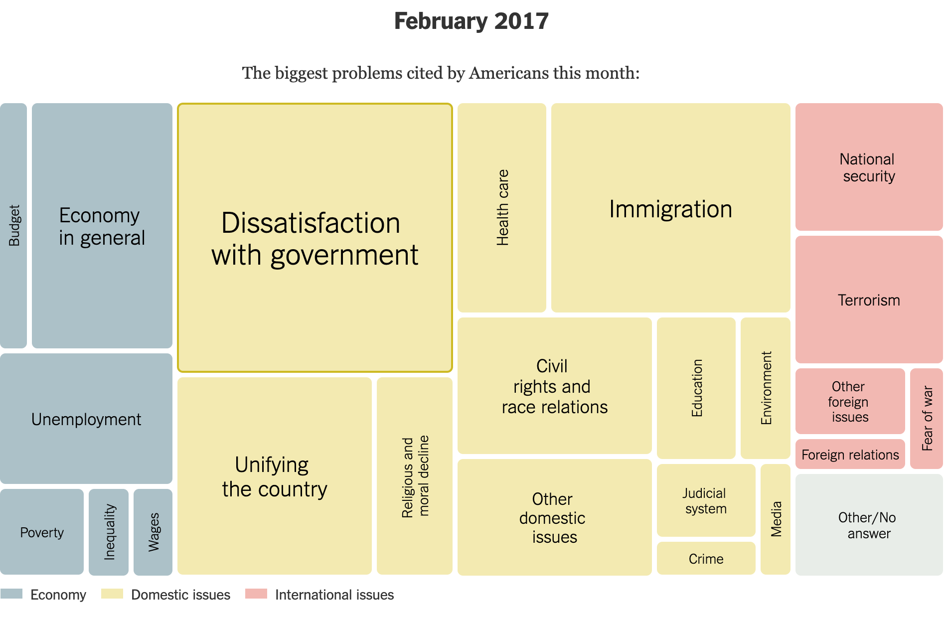 The New York Times created a striking visual summary of the nation’s top concerns. Using nested pink, yellow, and blue boxes of varying sizes, the graphic translates responses to the Gallup poll question, “What do you think is the most important problem facing this country today?” into a clear, hierarchical snapshot. This approach lets readers quickly see the issues that presidents faced from 1935 to the present, combining historical perspective with intuitive visual storytelling.